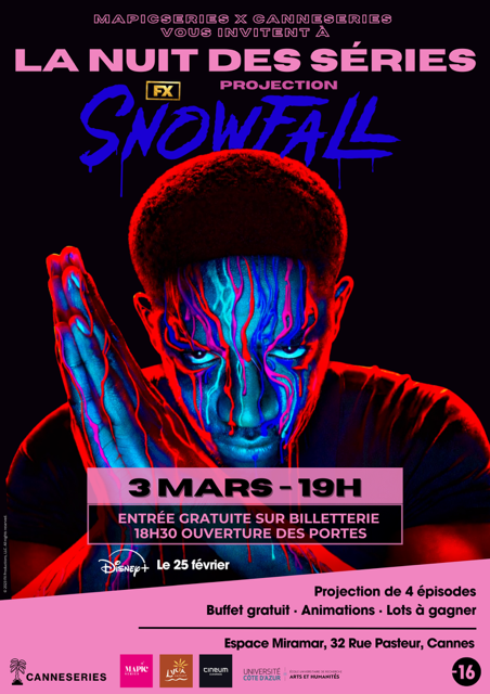 Pour cette troisième édition, les organisateurs ont choisi de mettre à l’honneur Snowfall, une série américaine diffusée sur Disney+. Créée par John Singleton, Eric Amadio et Dave Andron, la série retrace l’essor du crack dans les quartiers défavorisés de Los Angeles au début des années 1980, à travers les trajectoires croisées de trois personnages principaux.