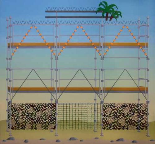 – Pour ce qui constitue la source mise en œuvre, c’est en effet à partir d’un corpus iconographique constitué qu’Amélie Bertrand travaille à la construction de ses compositions. Les éléments sont découpés, isolés, précisément parce qu’ils constituent les véritables icônes d’une culture dont nous sommes familiers. Se constitue ainsi un répertoire de motifs marqué par exemple par la récurrence des crénelures, forcément rapportées à l’architecture médiévale ; le damier, attaché à l’histoire de la perspective et sa représentation ; le palmier encore, image de la pop culture des années 80. Ostensiblement issues de toutes les périodes temporelles, de toutes les cultures, ces icônes ont pourtant été extraites de leur contexte et par là même vidées de leur signification. Établissant les bases d’un lexique neutre, non référentiel, l’artiste peut alors amorcer la composition du tableau à partir d’unités visuelles.
