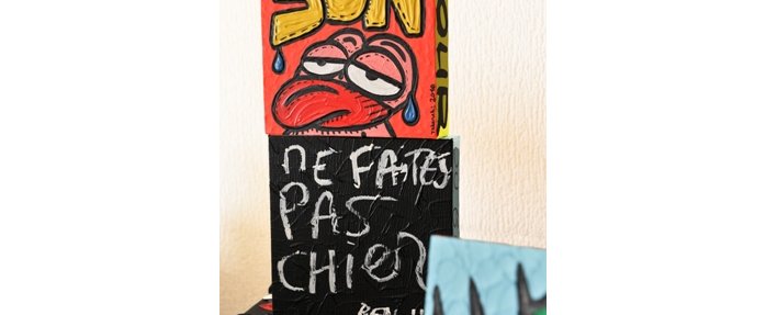Au total, le chat rose compte une soixantaine de productions. Même si certaines sont parfois détruites pour donner naissance à d’autres. Car Jérémy Taburchi est un adepte du recyclage. Et des moyens du bord. Il n’a plus de toile ? Il peint sur un tapis ! Pas de pinceau ? Il peint son autoportrait à l’aide d’une carte de visite… Silicone, plâtre, Jérémy Taburchi s’adonne aussi aux essais de matières. En témoignent les créations hétéroclites et les taches de peinture qui jalonnent les murs et le sol de son petit atelier situé non loin de Monaco…